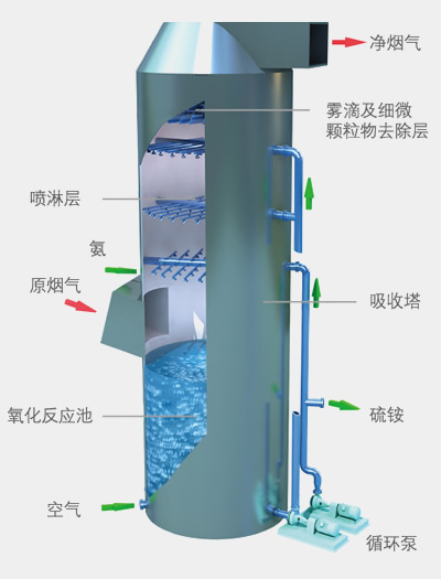 吸收形成的亞硫酸(氫)銨氧化成硫酸銨,硫酸銨溶液將煙氣溫度降低并蒸發(fā)水分,自身濃度得到進(jìn)一步提高。