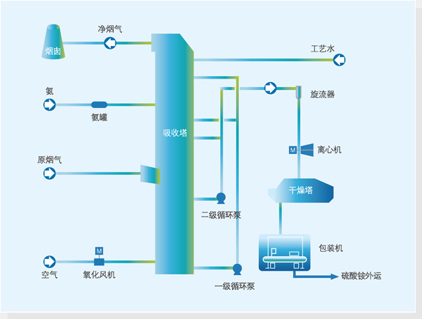 采用飽和結(jié)晶工藝,吸收系統(tǒng)產(chǎn)生一定固含量的硫酸銨漿液,再進(jìn)行固液分離、干燥和包裝,產(chǎn)出商品硫酸銨;采用蒸發(fā)結(jié)晶工藝,則是設(shè)置蒸發(fā)結(jié)晶系統(tǒng)對(duì)吸收系統(tǒng)產(chǎn)生的硫酸銨溶液進(jìn)行蒸發(fā)結(jié)晶,再進(jìn)行固液分離、干燥和包裝,產(chǎn)出商品硫酸銨。